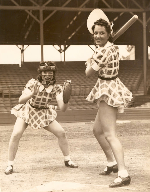 This amazingly cute photo of Mitzi in catcher's gear was probably taken in the 1940s. We don't know the location, nor do we know if Mitzi had any interest in the game. In all my years of conversation with Mitzi, she occasionally talked about her dancing days but never mentioned baseball. Obviously this photo was a set-up, and it's amusing that both offense and defense are wearing the same uniform!